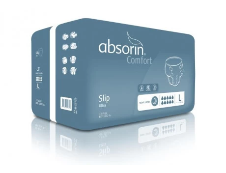 Absorin Comfort Slip est un matériau d’incontinence absorbant monobloc pour hommes et femmes, qui est fixé avec quatre bandes de fixation multi-grip. Absorin Comfort Slip est utilisé pour les pertes d’urine et de selles modérées à très importantes. Le Slip est disponible en six variantes différentes et quatre capacités d’absorption croissantes, pour le jour et la nuit.