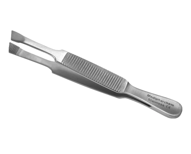 Pince à épiler à pointe large inclinée (5mm). Idéal pour éliminer tous les types de poils, chaumes et échardes. Acier inoxydable mat.